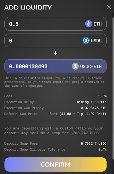 If you use the ‘Custom Ratio’ tab, deposited assets are automatically swapped to a 50:50 ratio.
