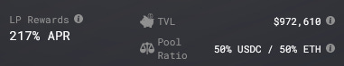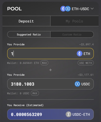 Step 2: Add liquidity. The pool maintains a standard 50:50 ratio but the app allows deposits ofETH and USDC in any ratio.