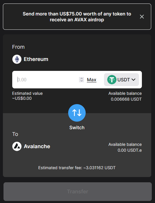 Step 2: Bridge your USDT. We’re going to use the official Avalanche Bridge since it provides an initial AVAX airdrop for gas fees, but there are many other options - Anyswap, Celer, Synapse etc.