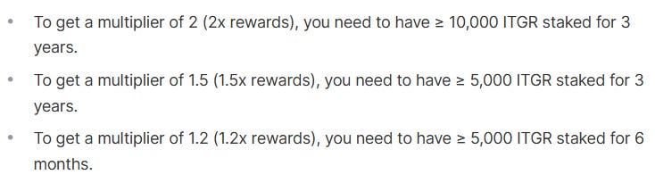 Note that rewards are vested linearly over six months, meaning that you will receive 1/180 of your ITGR tokens each day. However, the current yield of 217% APR makes it appealing.