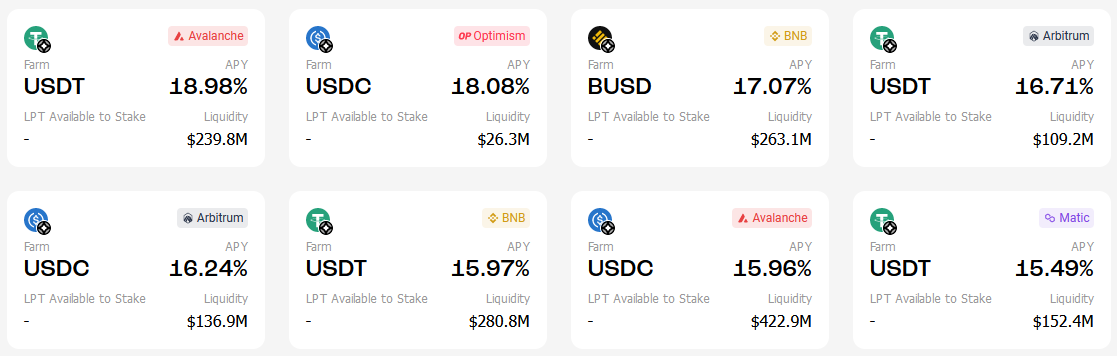 Stablecoin farming pools are available on seven chains: Mainnet, Avalanche, Polygon, Binance Chain, Arbitrum, Optimism and Fantom.